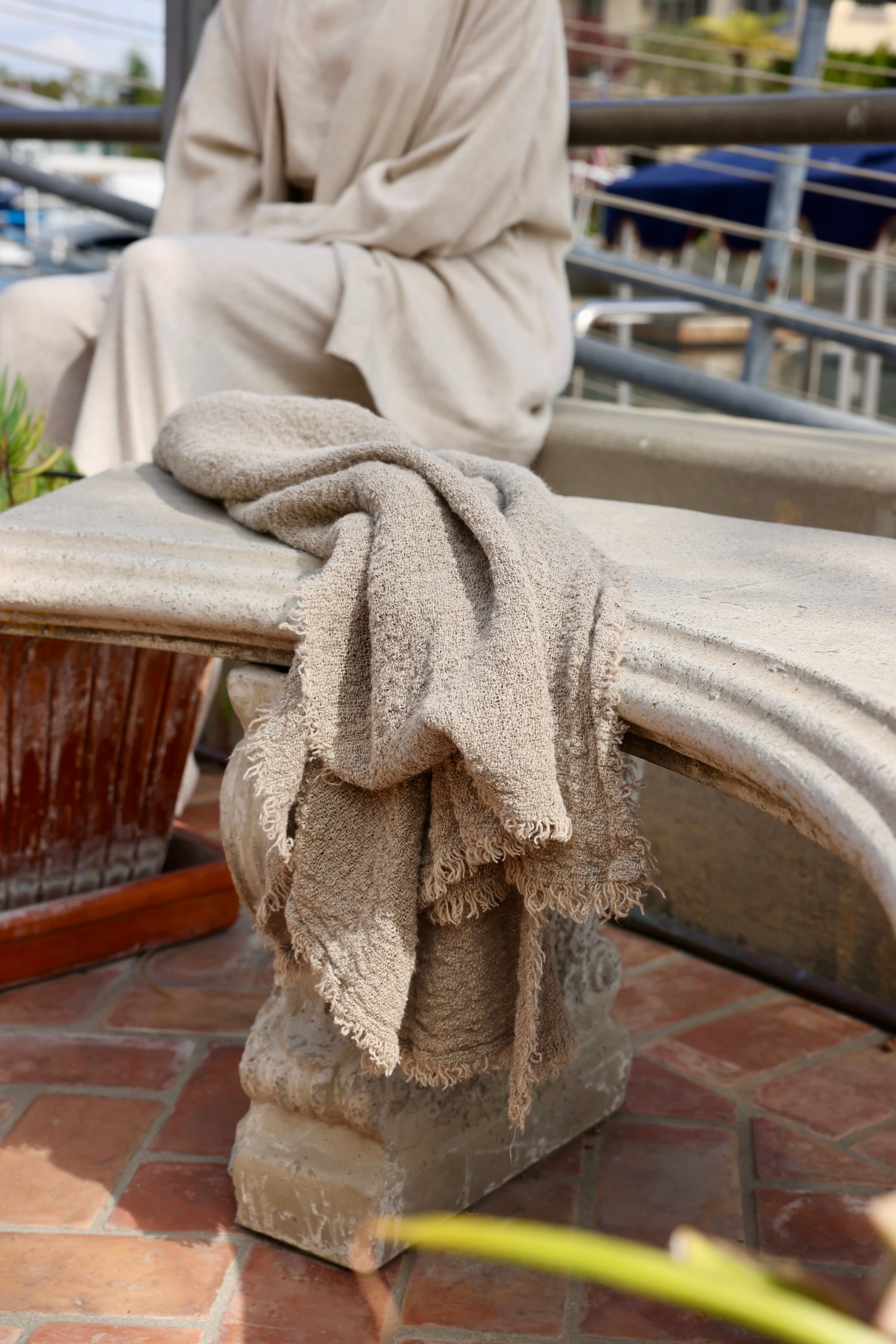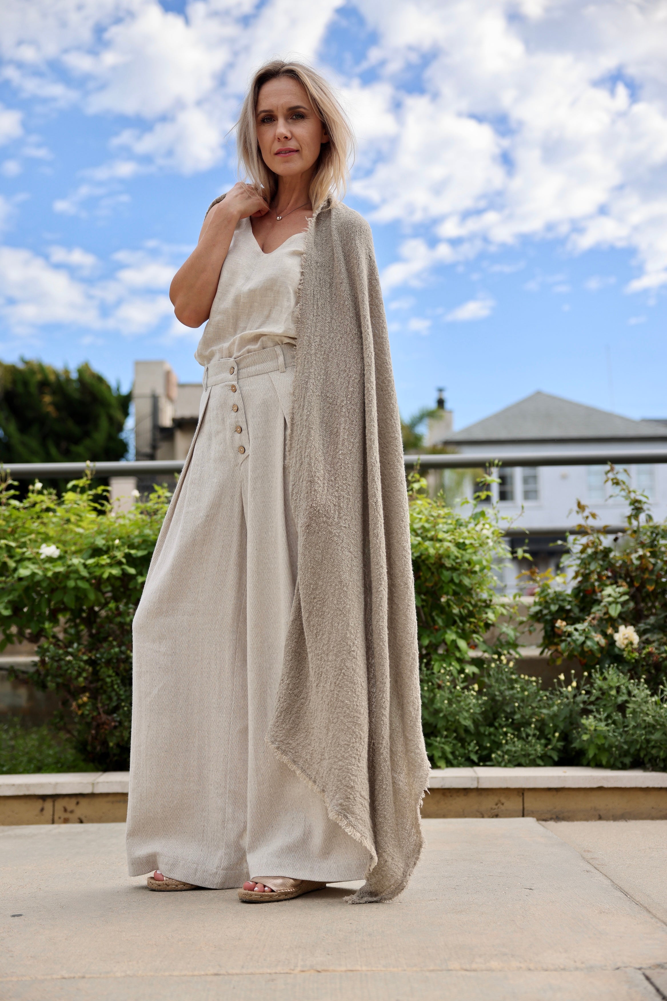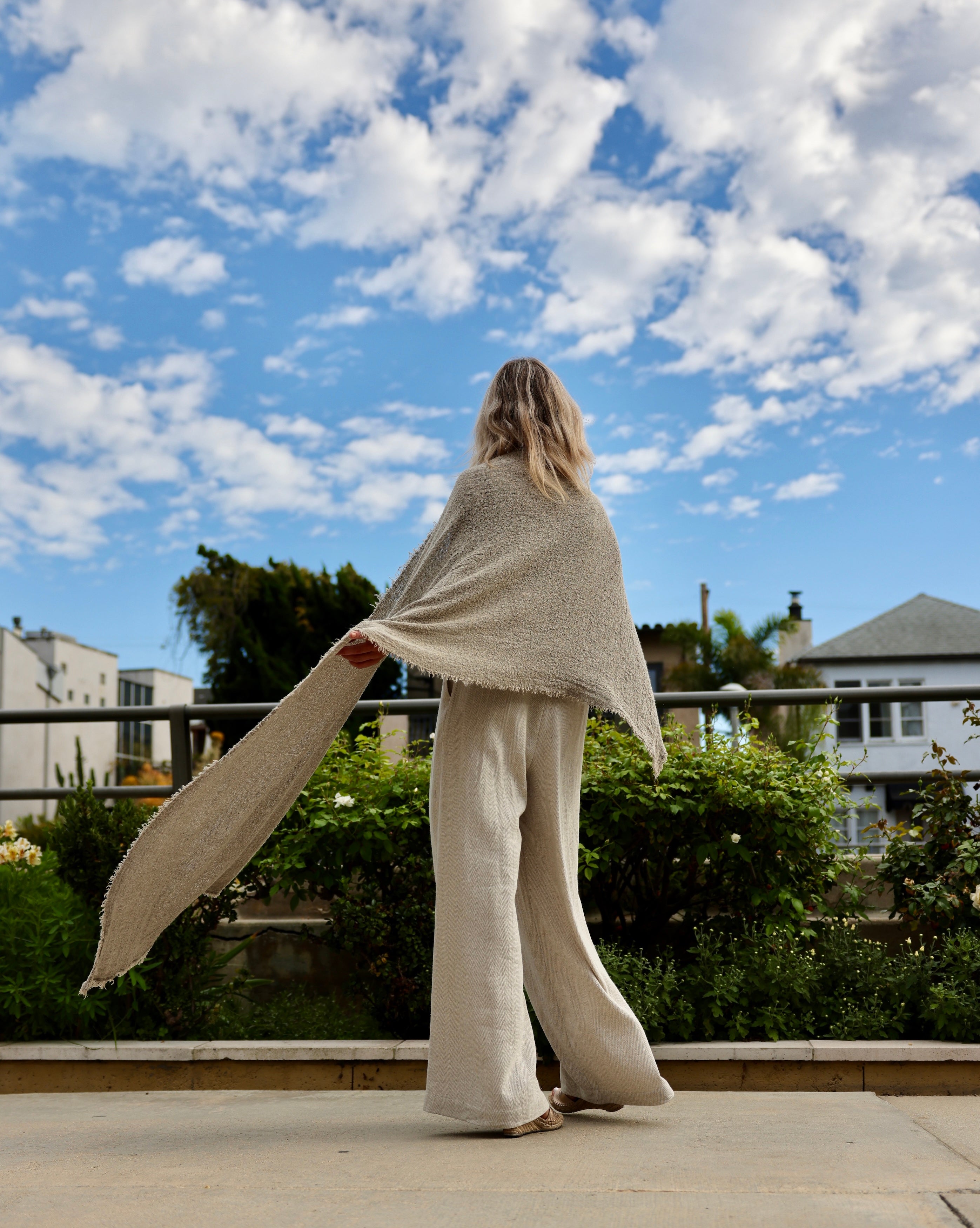 The Anouk Shawl is crafted from 100% raw linen that retains its natural character and undyed authenticity. Softened through a gentle, non-chemical process, this generously sized piece offers remarkable versatility—wear it as a shawl, scarf, or layering cover-up. Due to the Netta linen porous weave being softened, the fabric acquires stretch, which provides comfortable movement while delivering genuine warmth, making it an ideal companion for transitional seasons. Its textured surface adds visual depth and dimension to any ensemble, from casual to refined. A timeless piece that celebrates natural fibers and understated elegance.