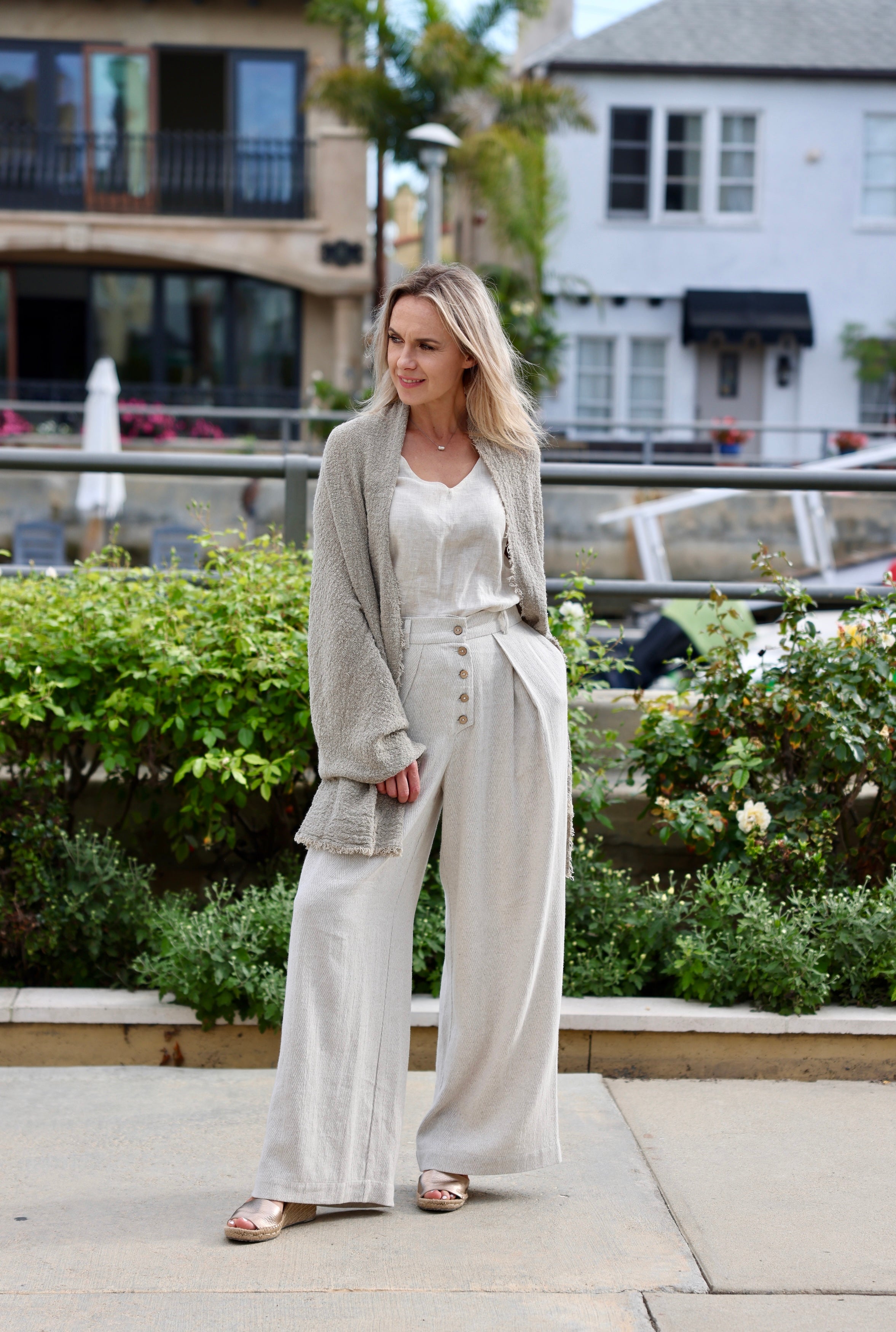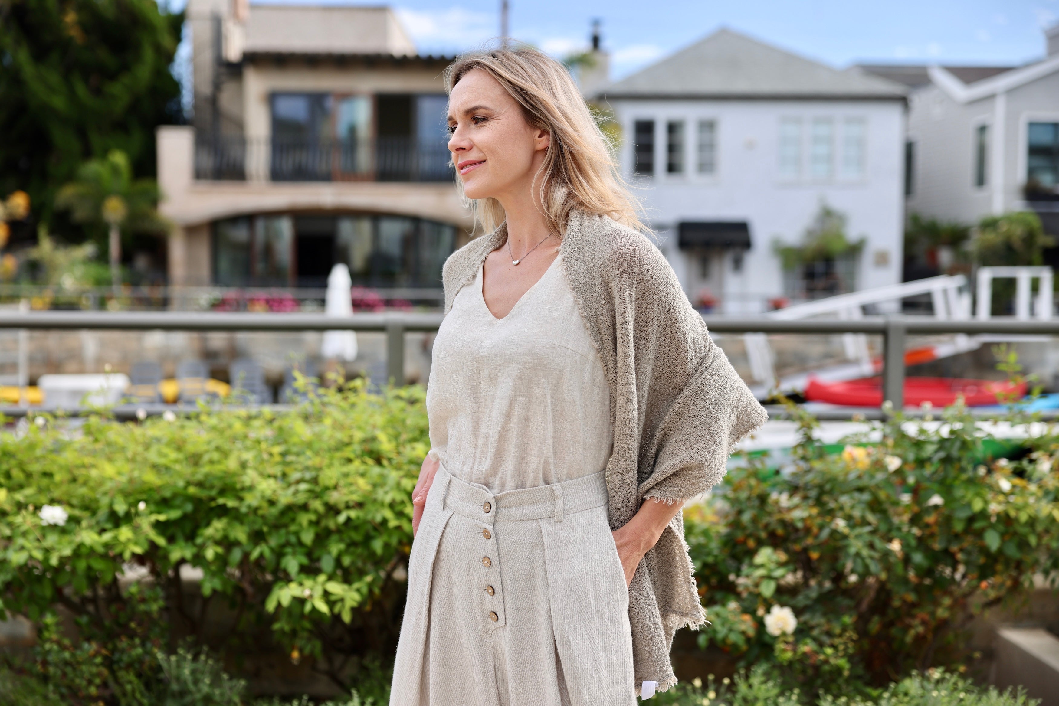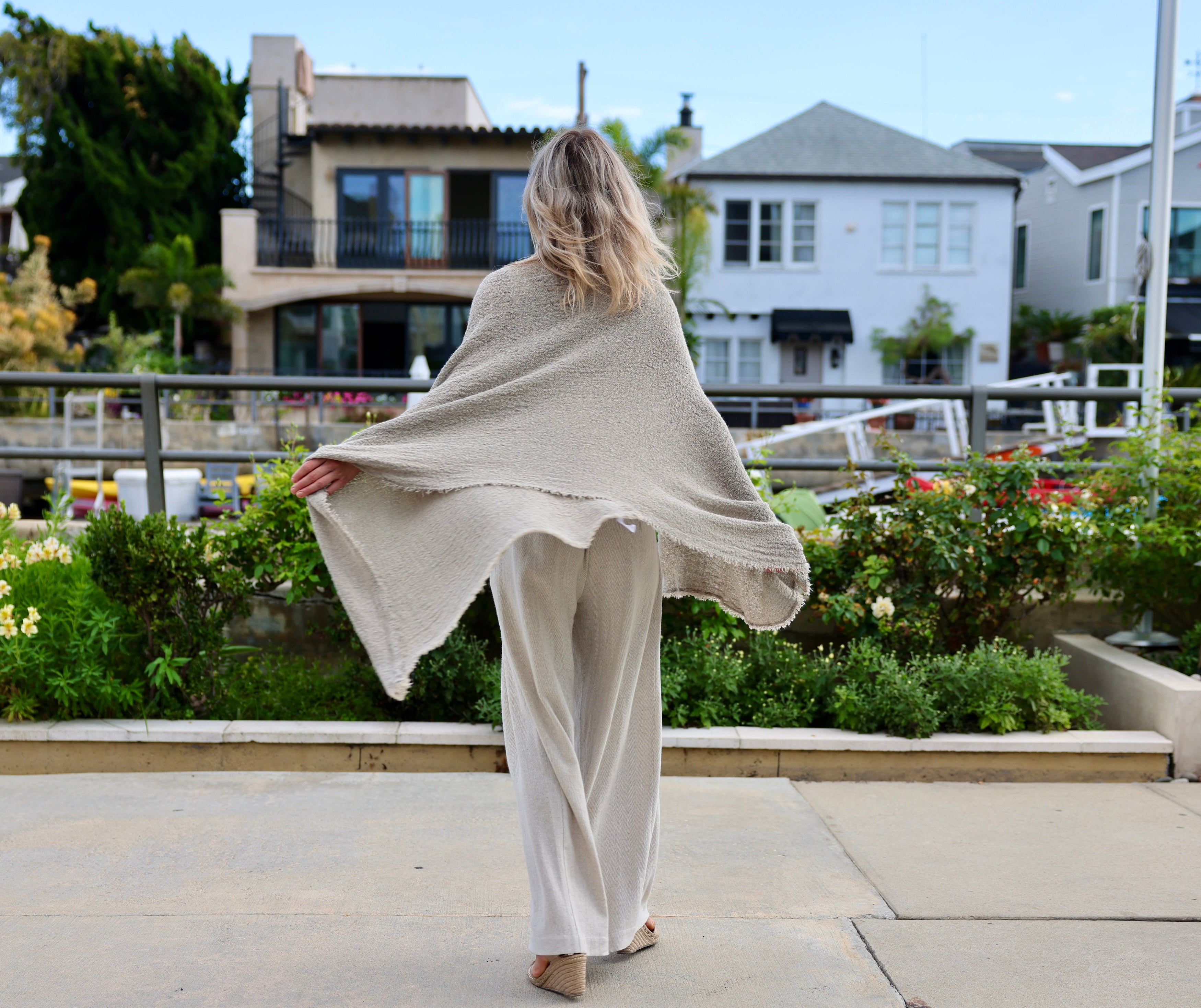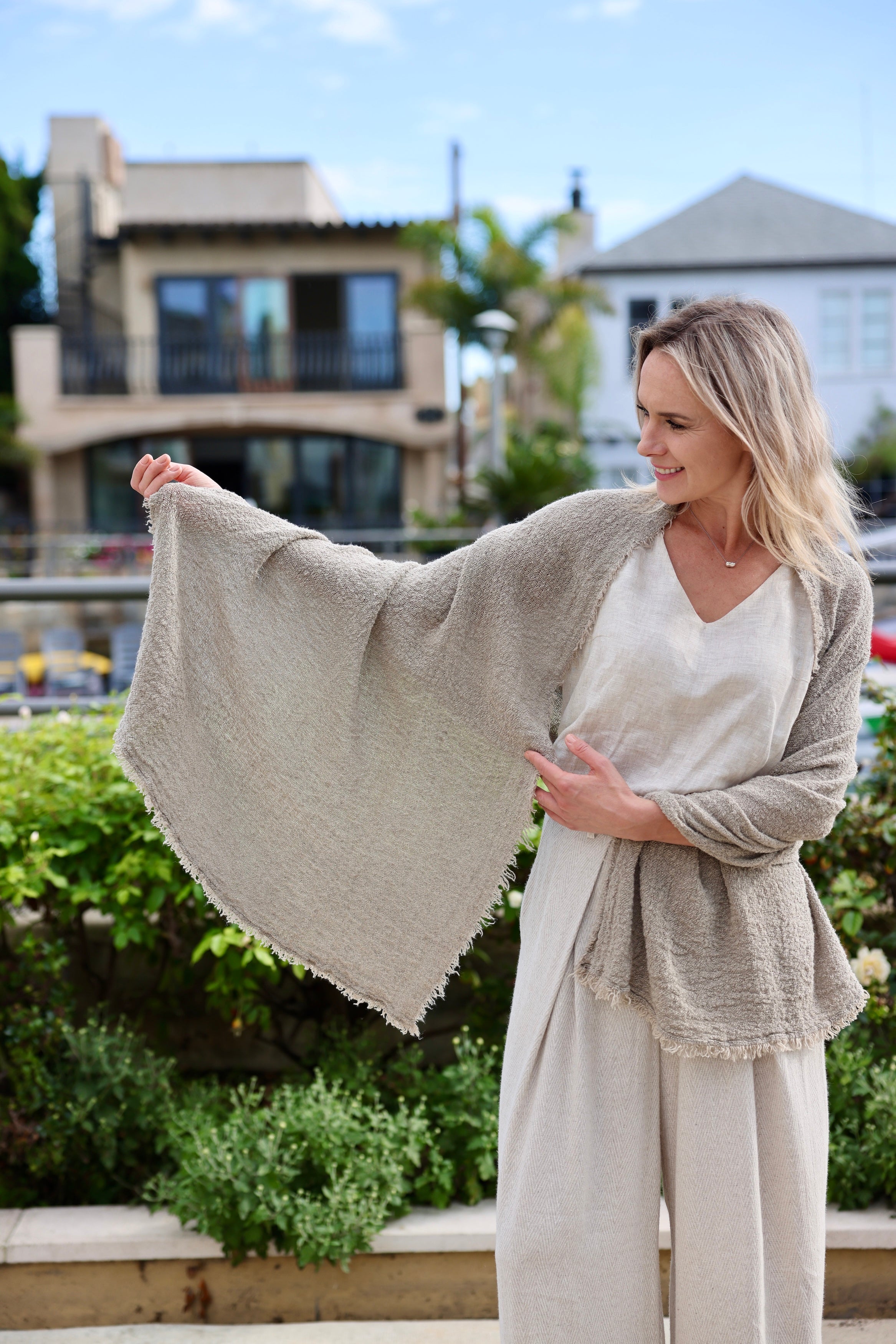 The Anouk Shawl is crafted from 100% raw linen that retains its natural character and undyed authenticity. Softened through a gentle, non-chemical process, this generously sized piece offers remarkable versatility—wear it as a shawl, scarf, or layering cover-up. Due to the Netta linen porous weave being softened, the fabric acquires stretch, which provides comfortable movement while delivering genuine warmth, making it an ideal companion for transitional seasons. Its textured surface adds visual depth and dimension to any ensemble, from casual to refined. A timeless piece that celebrates natural fibers and understated elegance.